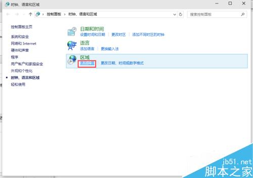 弹出“时间语言和区域”对话框,点击“区域”大类中的“更改位置”