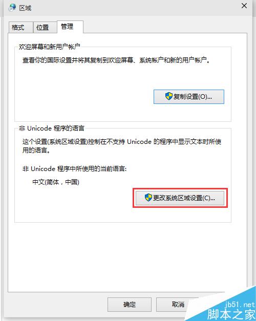 在弹出的“区域”对话框中,选择“管理”选项卡,点击下面的“更改系统区域设置”
