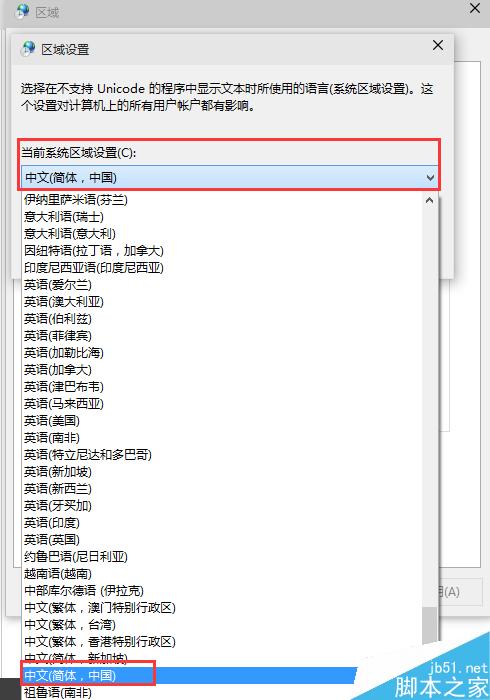 在弹出的“区域设置”对话框中,将系统区域更改为“中文(简体,中国)”