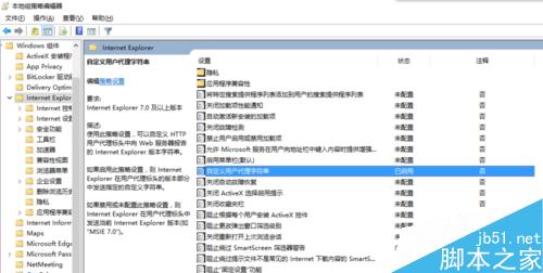 WINDOWS键+R 或者在开始菜单-运行中输入gpedit.msc,然后回车进入策略组。然后依次找到计算机配置--管理模板--windows组件--internet explorer,在右侧找到“自定义用户代理字符串”双击打开