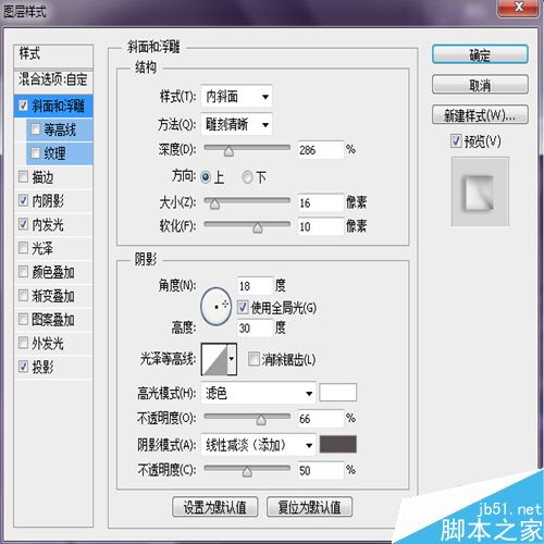 结构:样式为内斜面,方法为雕刻清晰,深度为286%,大小为16像素,软化为10像素。