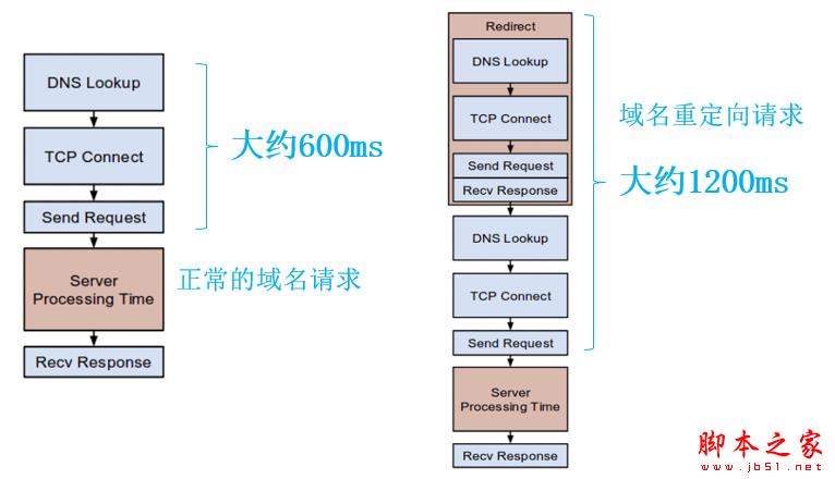 这是一个同一网速下的测试结果,重定向之所以会比较慢,是因为它重复了域名查找,tcp链接,发送请求。