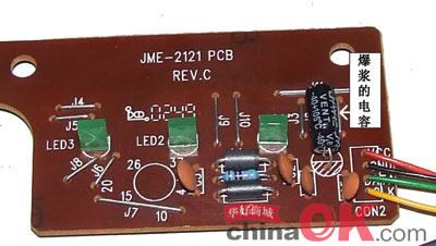 故障分析:从走线方向来看,该电容为键盘控制电路电源的滤波电容,具体的线路原理一时搞不明白,但可以肯定的是电容的“爆浆”造成键盘失效。