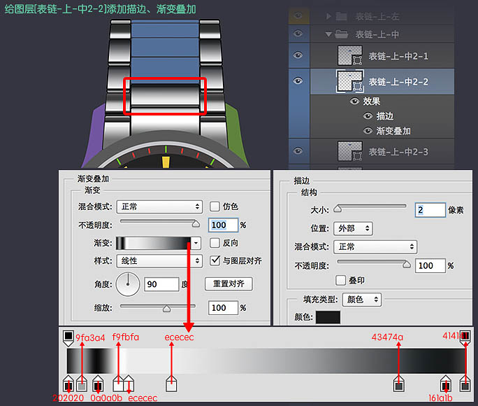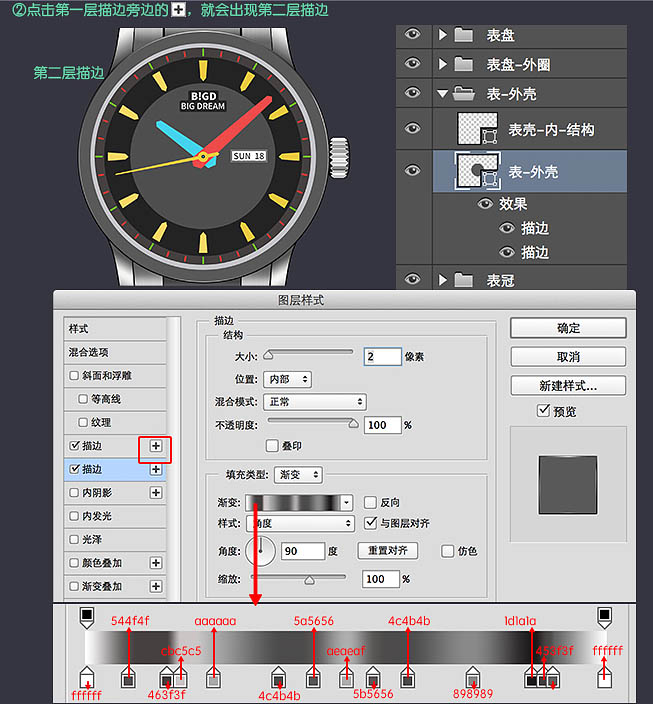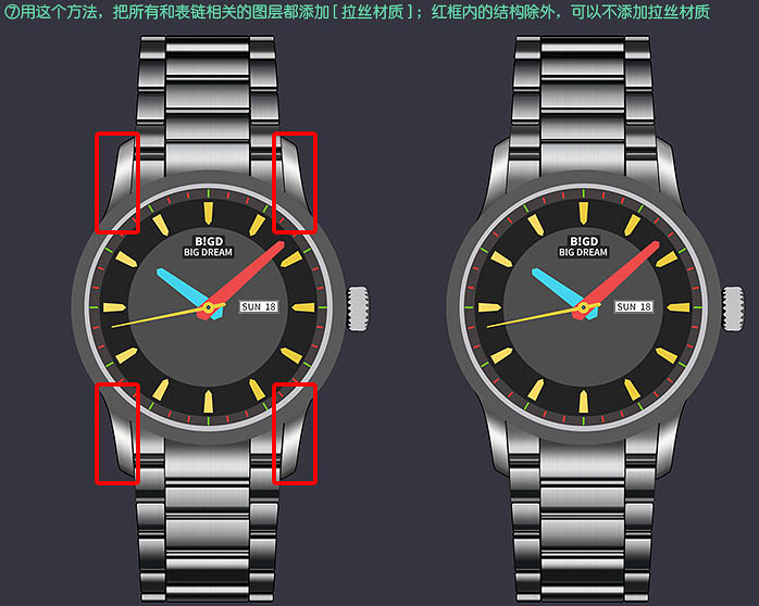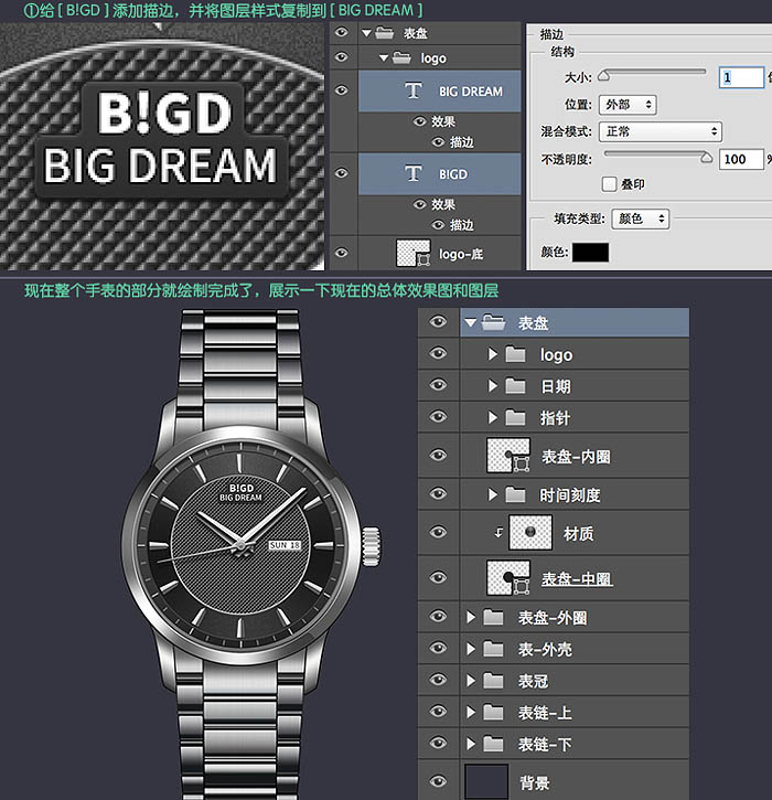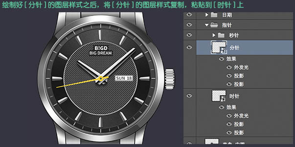 绘制名表之前,要对表的结构有全面的了解;然后画出色块图;再用渐变、图层样式、图案、画笔等给表的每个部分增加颜色和质感;最终再整体细调即可。
