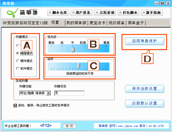 神盾:某些游戏会和《简单游》软件产生冲突,“神盾”就是避免此类事情发生的强大盾牌。一般不需要点此按钮,需要打开神盾的游戏也都会在脚本说明中明确提示。 |