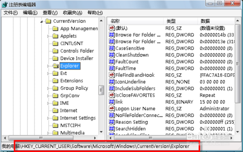 3、在“注册表编辑器”中定位到“HKEY_CURRENT_USER\Software\Microsoft\Windows\CurrentVersion\Explorer”。