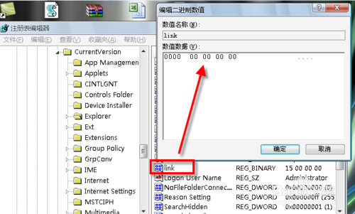 4、在右侧窗格中新建或找到一个名为“link”的“二进制值”。将其值修改为“00 00 00 00”。