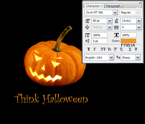 选择横版文字工具,选择合适的尺寸、字体、颜色。这里我用了Curlz MT Regular字体,在图像下输入 Think Halloween 按Enter确认。