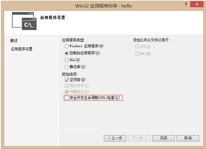 4、无需在程序最前面加那行代码,只需在新建项目时取消勾选“SDL检查”即可;