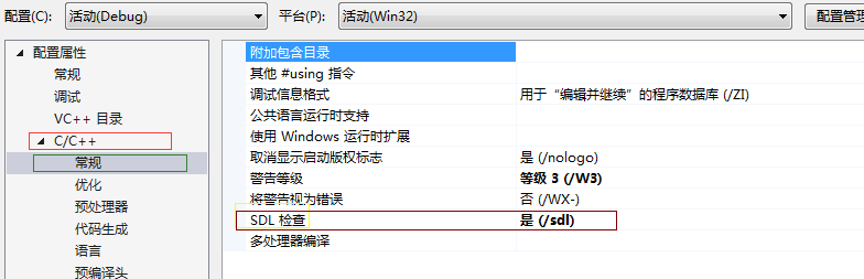 5、若项目已建立好,在项目属性里关闭SDL也行;我用的VS是中文版的