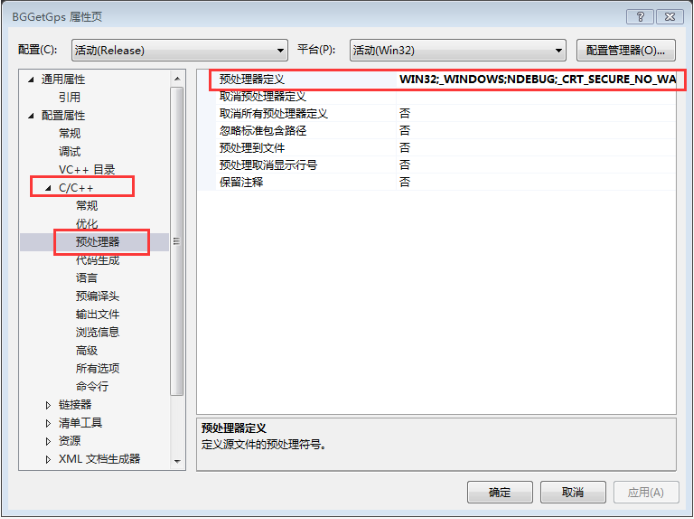 6、在工程项目设置一下就行:将报错的那个宏定义放到:项目属性-----C/C++----预处理器 ------预处理器定义