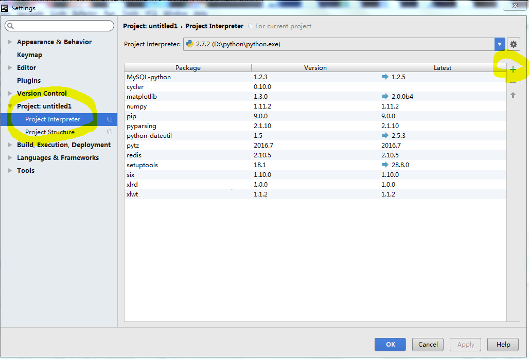找到project_interpreter右边的加号减号就是对各个模块的管理,点击加号: