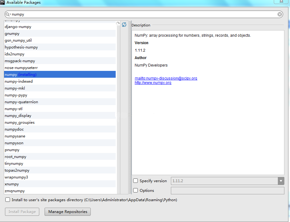 搜索numpy,点击InstallPackage,即可安装,保证网络畅通!!等待即可~~