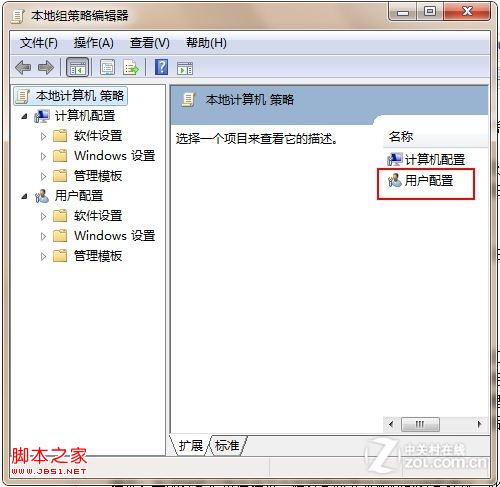 本地组策略编辑器 运行“gpedit.msc”并打开,便弹出如上图所示的窗口,在对话框中,我们看到有两项分别为“计算机配置”和“用户配置”,点击“用户配置”进入下一步。