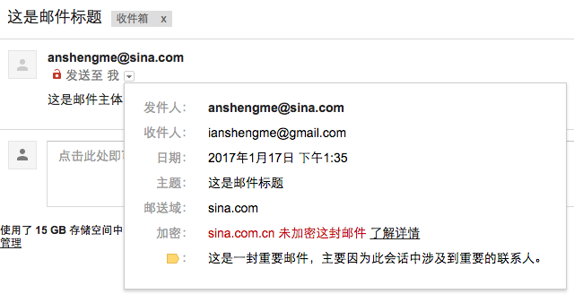 In [2]: send_mail("这是邮件标题", "这是邮件主体", 'anshengme@sina.com', ['ianshengme@gmail.com'])