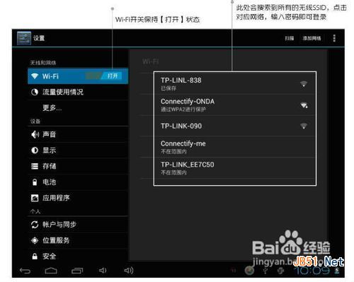 2、在平板打开WiFi开关,在发现对应你自己的无线路由器的SSID名称点名称输入密码后即可连接,方法如下图: