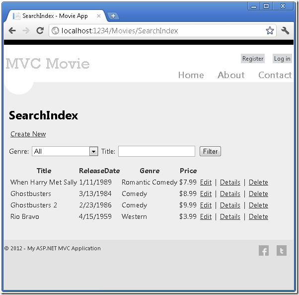 您现在有一个完整的 ASP.NET MVC 应用程序并在本地的 DB 数据库中存储数据。您可以创建、 读取、 更新、 删除和搜索电影。