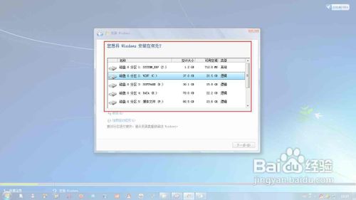 12、选择Win7要安装到的分区。如果选C盘,则原有2003/XP系统文件将被移动到 Windows.old文件夹,那么最好保证C盘有足够的剩余空间(至少15G),安装好后可以将它们从C盘删除,如果选其他盘,则为双系统。Win7安装到的盘最好有30G剩余空间。Win7安装程序不会删除原有分区中的文件,但是如果装双系统,最好先把win7要装的分区格式化一遍。