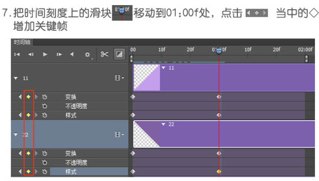 7、把时间刻度上的滑块移动到下图位置,点击下图左侧红框中的菱形增加关键帧。
