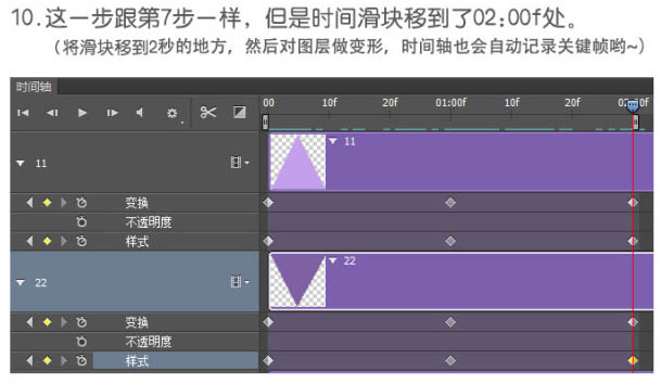 5、把时间轴面板左侧,11和22图层的小三角展开;可以看到“变换”,“不透明度”,“样式”的项目,意思是时间轴可以记录这个图层的这些变化。