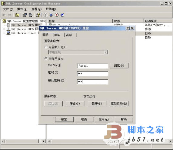 启动服务帐户,选择本帐户,输入:.\帐号名,输入密码,点确定,就OK了