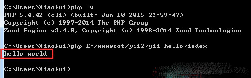 在命令行敲入“php yii项目所在路径/yii 控制器名/方法名”,例如“php E:/wwwroot/yii2/yii hello/index”,如下图所示。