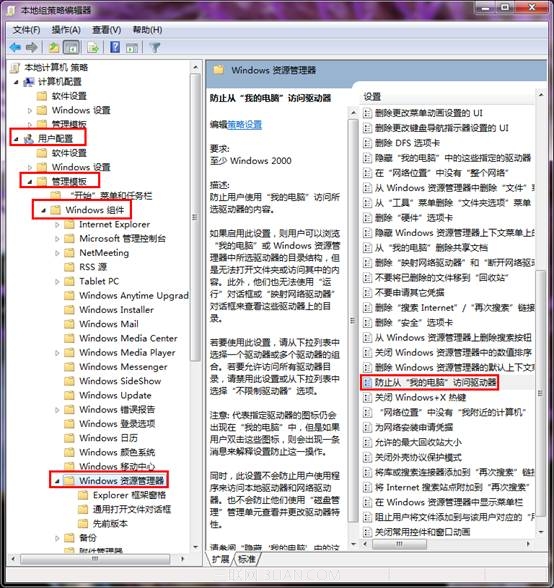步骤二:用户配置→管理模板→Windows组件→Windows资源管理器”,然后到右边的窗格中双击“防止从‘我的电脑’访问驱动器”项;
