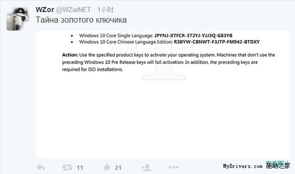 俄罗斯爆料大神WZor这两天非常给力,接连送出Windows 10的相关猛料。现在,他甚至给出了Windows 10预发行版的产品密钥。