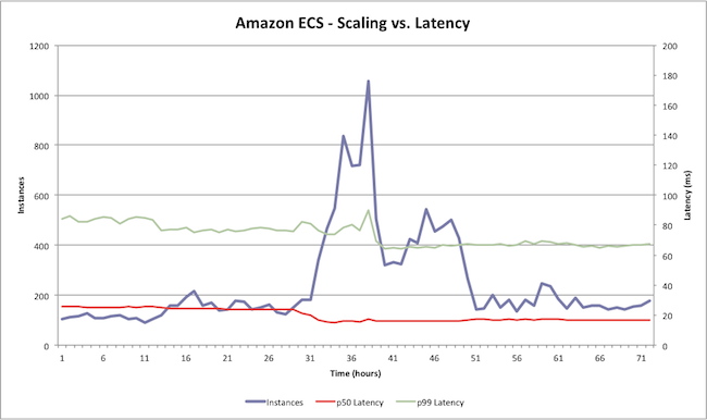 上图显示了一个负载测试的结果,在这次测试中,我们在Amazon ECS集群中添加和删除实例,并测量72小时的周期内,调用‘Describe Task’API时,百分比排列位于第50位和第99位的延迟。你可以看到,尽管集群数量有较大的波动,但是延迟相对而言并没有什么抖动。Amazon ECS可以如你所需地进行扩展,不管你的集群规模有多大,且根本无需操作或扩展集群管理器。
