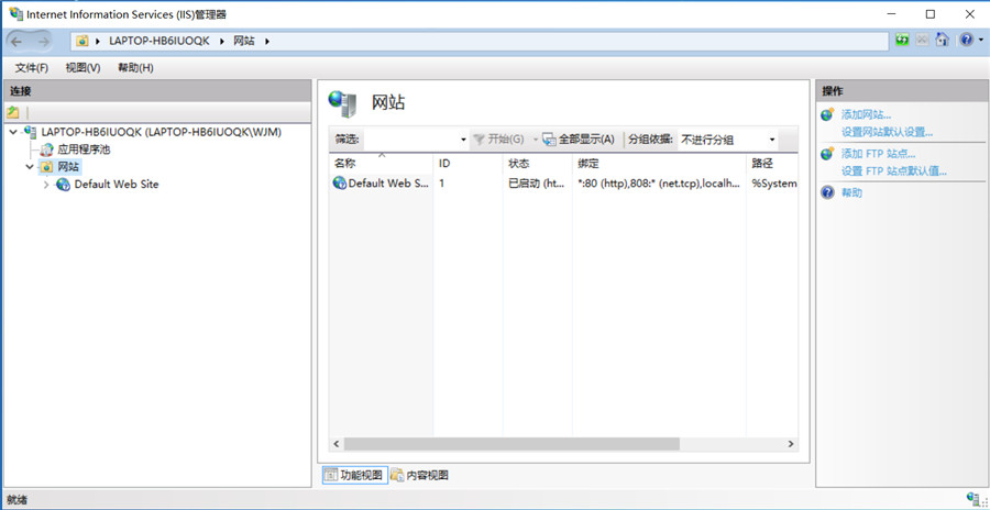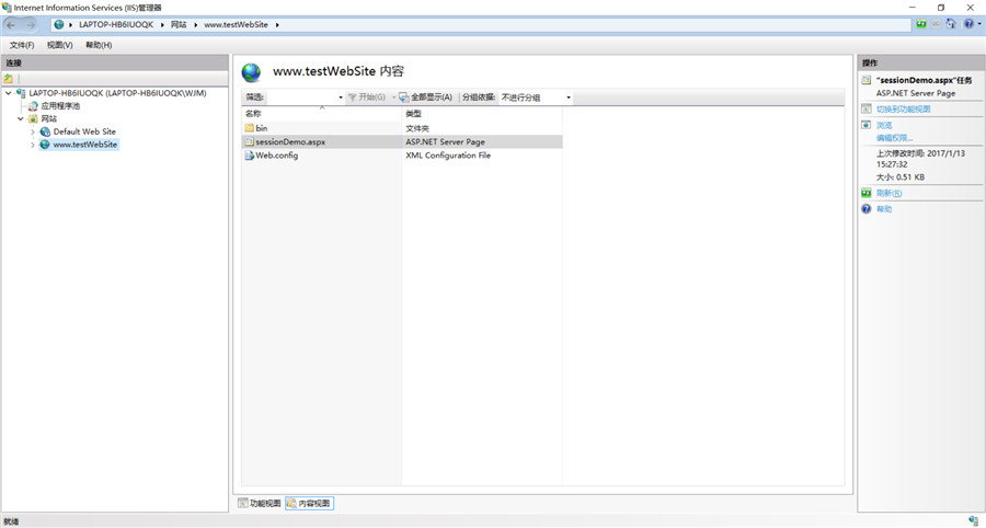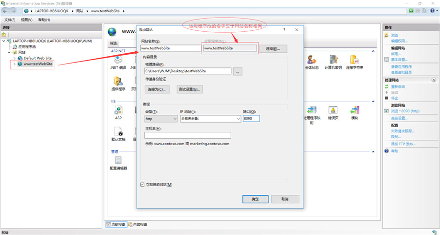 5、此时,IIS主界面,“网站”多了一个站点“www.testWebSite”,即是刚才给站点取得名字。