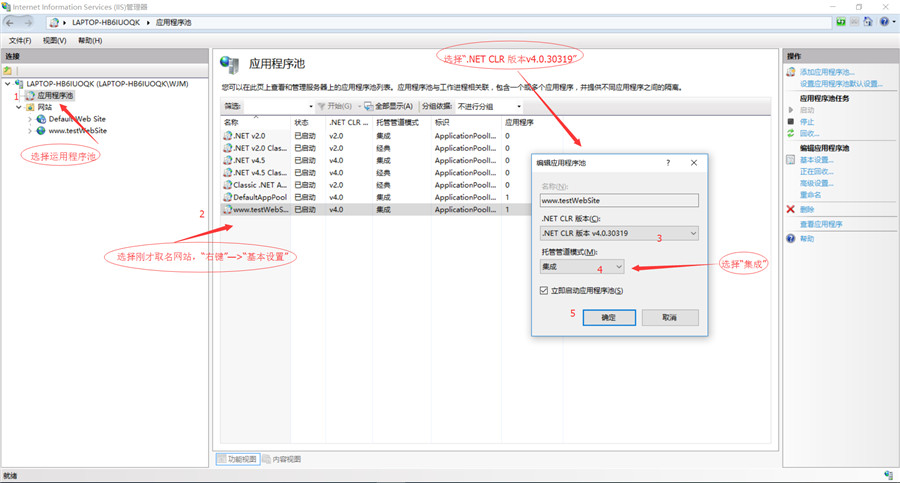 6、运用程序池,应选择与网站名称相同,选择集成方式(当都发布不成功时,可以经典与继承来回切换测试),选择版本V4。