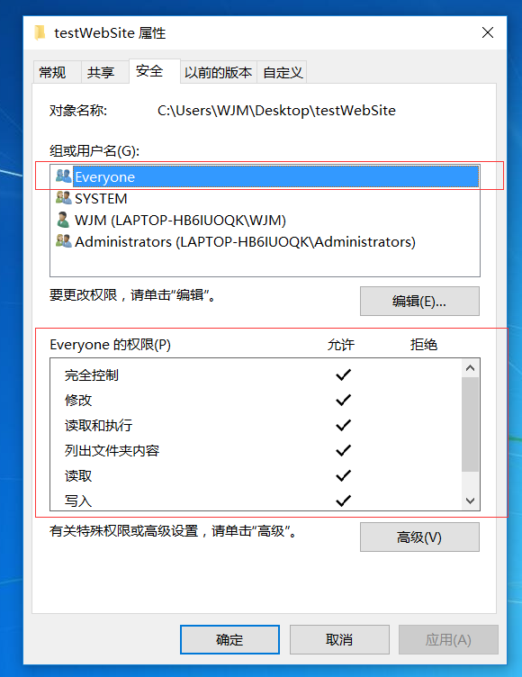 9、为了防止权限不足,将刚才发布的文件添加成员“everyone”,并赋予权限。右键—>属性—>安全—>编辑—>添加