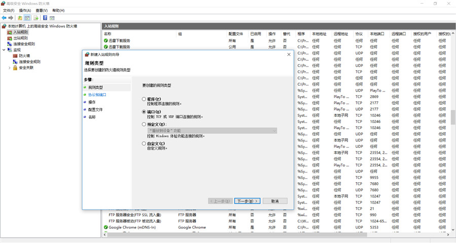 的窗口依次选择:选中端口—>下一步—>选中TCP以及特定本地端口填入要开放的端口号(这里填入80;当让也可以选择开放所有端口