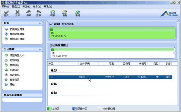 1、 下载免费的分区助手,安装并运行。磁盘情况如图1所示,从图上可以看到磁盘1上只有一个分区C,约80GB,没有更多的分区。下面就在C盘的基础上快速的创建三个新的分区为例: