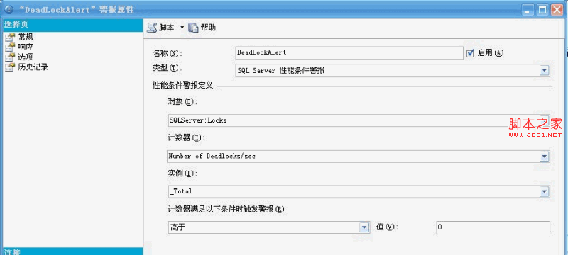 在"响应"选项卡中,选中"执行作业",并选择步骤3中我们新建的作业(即DeadlockJob)