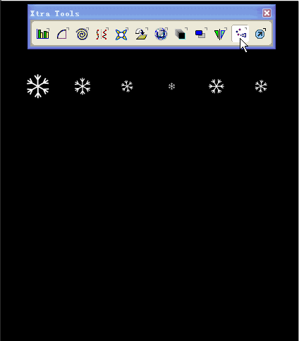 将雪花全部贴入后,关闭喷管面板,再次选择喷管工具,在黑色背景上按下鼠标左键不放,画出一个任意形状来,大小不一的雪花从鼠标下喷出,很好玩的。你也可以一朵一朵的喷,方法是一下一下的按鼠标左键。这个工具在画树叶、草地、下雪天等画面时特别有用。