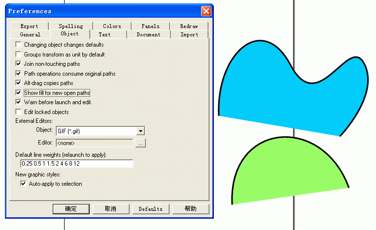 选择菜单Edit\Preferences命令,调出Preferences面板,再选择Object标签,在其下面的选项里勾选Show fill for new open paths,如图中虚线所框住的部分即是。点“确定”后再画一条不封闭曲线,为其加填充色,如图中所示,颜色以直线的方式连贯开放曲线的两端。