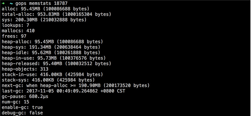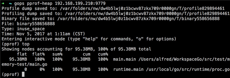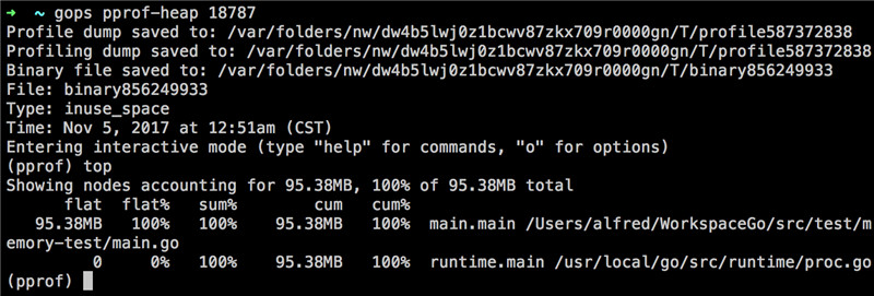 可能有人注意到了上面我的 memory-test 程序后面有个 * 号。这是因为程序中我加入了 gops 用的诊断支持代码: