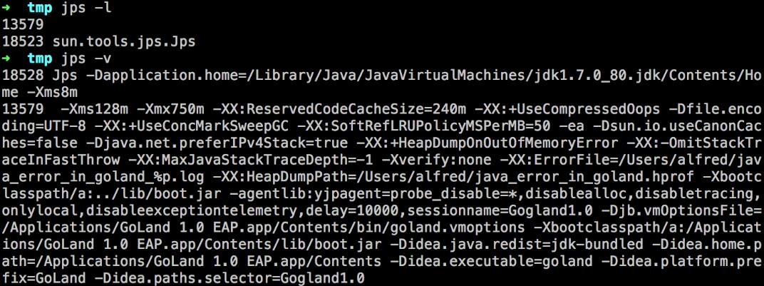 会依次列出 PID,PPID,程序名称,编译使用的 Go 版本号,程序路径。信息比 jps 还详细,不错哦。