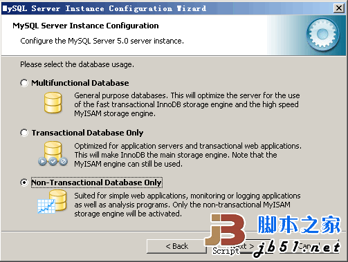 选择MySQL数据库默认存储方式:Non-Trans Only (MYISAM)