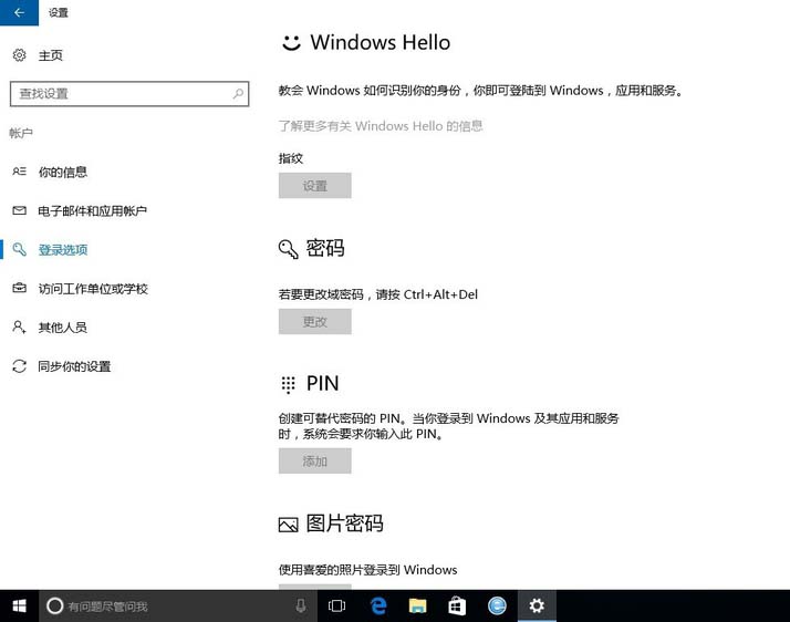 4、设置指纹和pin码:设置--账户--登陆选项--此时可以看到指纹和pin的添加按钮都是可用的了