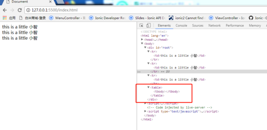 大家可以看到出错啦?正常的三个 tr 应该是在 tbody 里面, 而现在跑到跟 tbody 同一层了,这是怎么回事呢?