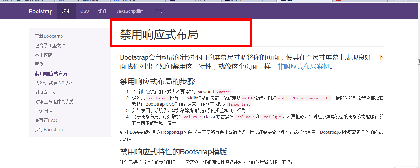 在上面我们也启用了响应式的布局。当然有些网站可能并不需要进行响应式的布局,我们就需要进行手动的禁用这个布局,这个文档当中也有详细的说明。