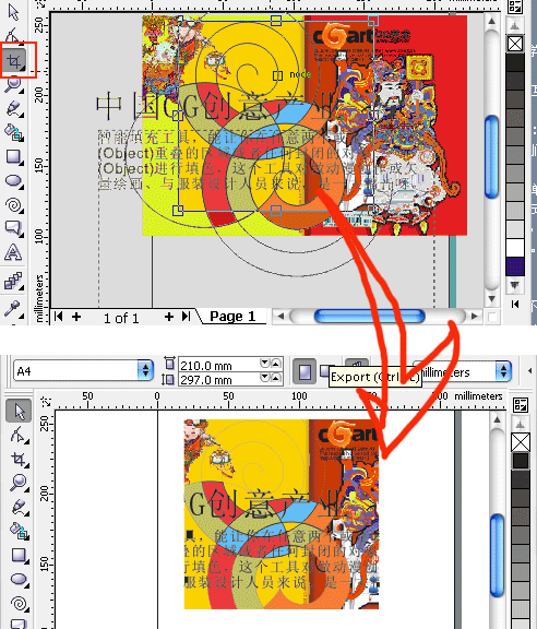 这个截切工具非常实用,可以称之为power crop了:)。它可以对画面里的任意对象进行裁切,但不同于精确剪裁(powerclip),powetclip如果对多个对象对象进行剪裁,必须先群组(crtl+g,group),新的裁切工具可以对画面的混合对象进行一次性crop,如下图,这个画面里有边形,还有位图,段落文本与美工字