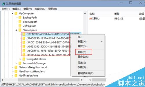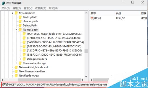 打开注册表编辑器后,定位到HKEY_LOCAL_MACHINE\SOFTWARE\Microsoft\Windows\CurrentVersion\Explorer\MyComputer\NameSpace\