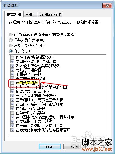 大家可以先关闭“玻璃效果”看一下,如果显示的问题解决了,就不要关闭“启用桌面组合”了。毕竟关闭了“启用桌面组合”就没法用“Aero Peek”效果了。