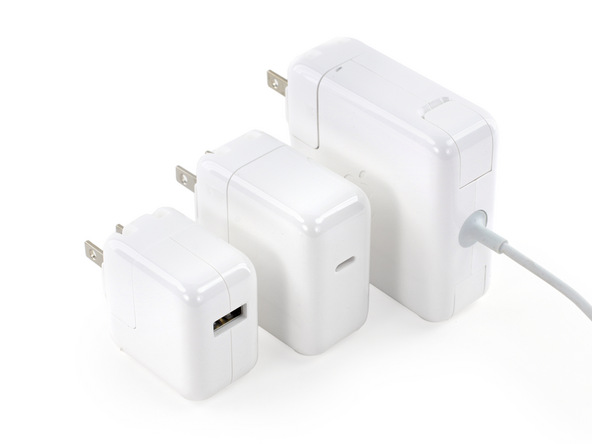 下图中三款电源适配器分别是10W iPad USB 适配器(左侧)、29W USB-C 电源适配器(中间)和60W MacBook Air MagSafe 2 电源适配器(右侧)。这也是第一台没有 MagSafe 的 MacBook