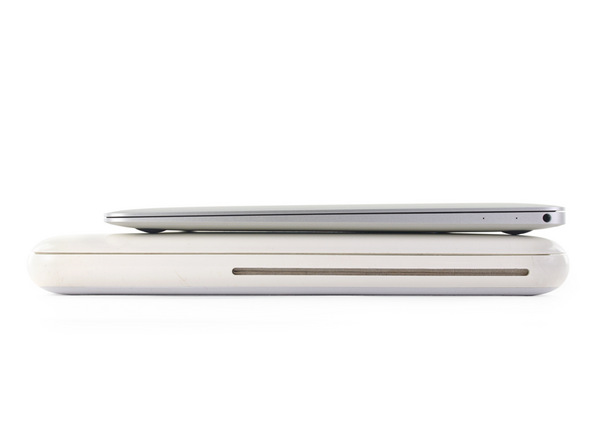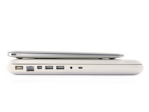 全新 MacBook 的厚度不到2009款 MacBook 的一半,最厚的地方只有0.52英寸。2009款 MacBook 厚度为1.08英寸,重量为5磅,而 Retina MacBook 的重量只有2.03磅。2009款 MacBook 上,有 MagSafe、以太网、Mini DisplayPort、两个 USB、音频接口和安全锁孔。