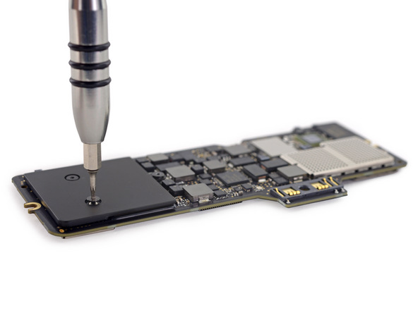 小心翼翼的将 MacBook 主板从铝金属外壳上拆下。苹果提到 Retina MacBook 的主要要比11寸 MacBook Air 的小 67%。苹果在 MacBook 中使用了英特尔 Core M 处理器,这款处理器可以减小尺寸以及散热。