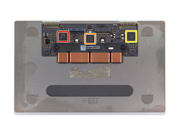 只有四个应变计,就像之前13 寸 Retina MacBook Pro 上的 Force Touch 触控板,MacBook 的触控板可以感知手指的压力,而不会移动。